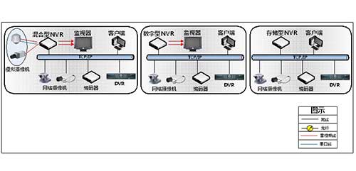 纯数字型NVR监控前端可接入各种网络摄像机和管理异质的DVR系统,可直接本地化输出显示;混合型NVR监控前端可接入各种类型的模拟摄像机和网络摄像机以及管理异质的DVR系统,支持本地化输出显示;存储型NVR监控前端可接入各种网络摄像机和管理异质的DVR系统并作本地存储。